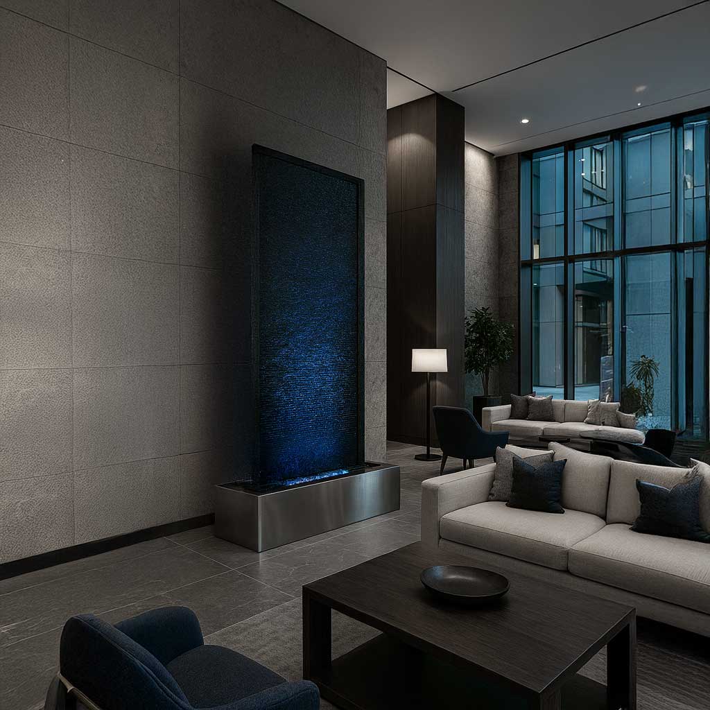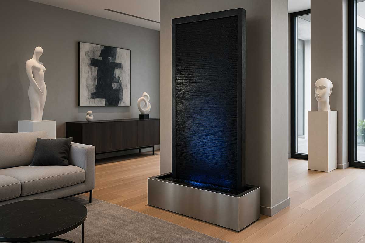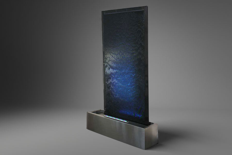Die Naturstein Wasserwand “Gemini Nimbus” hat einen einseitigen Wasserlauf, der aus der Wand “entspringt”.