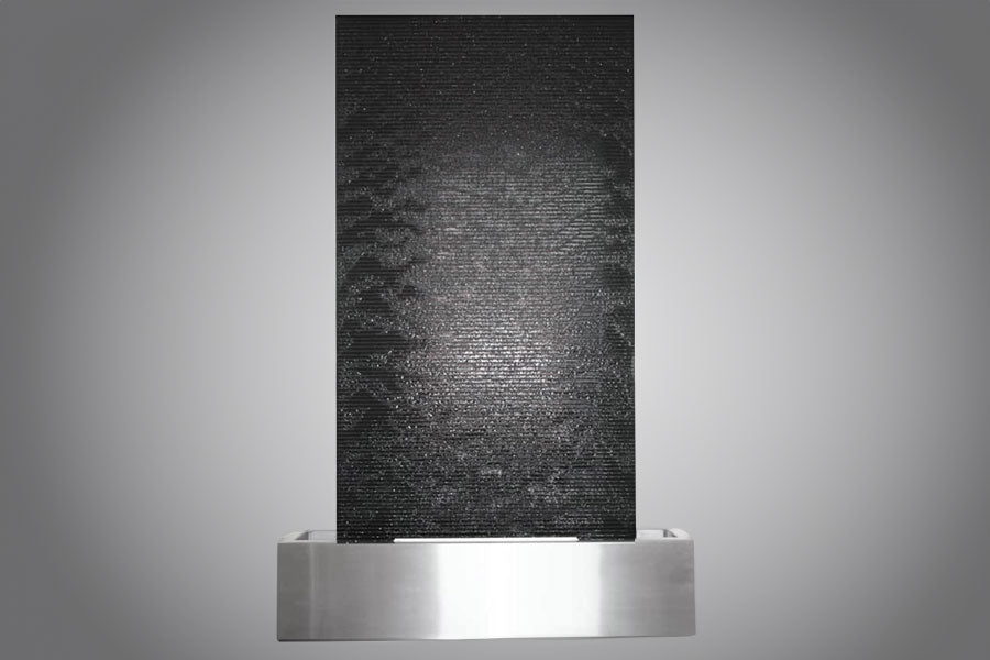 Das Wasser entspringt dem Stein in ca. 190 cm Höhe und läuft über 90% der Breite der Gesamtsäule und mündet in ein exklusives Edelstahlbecken.