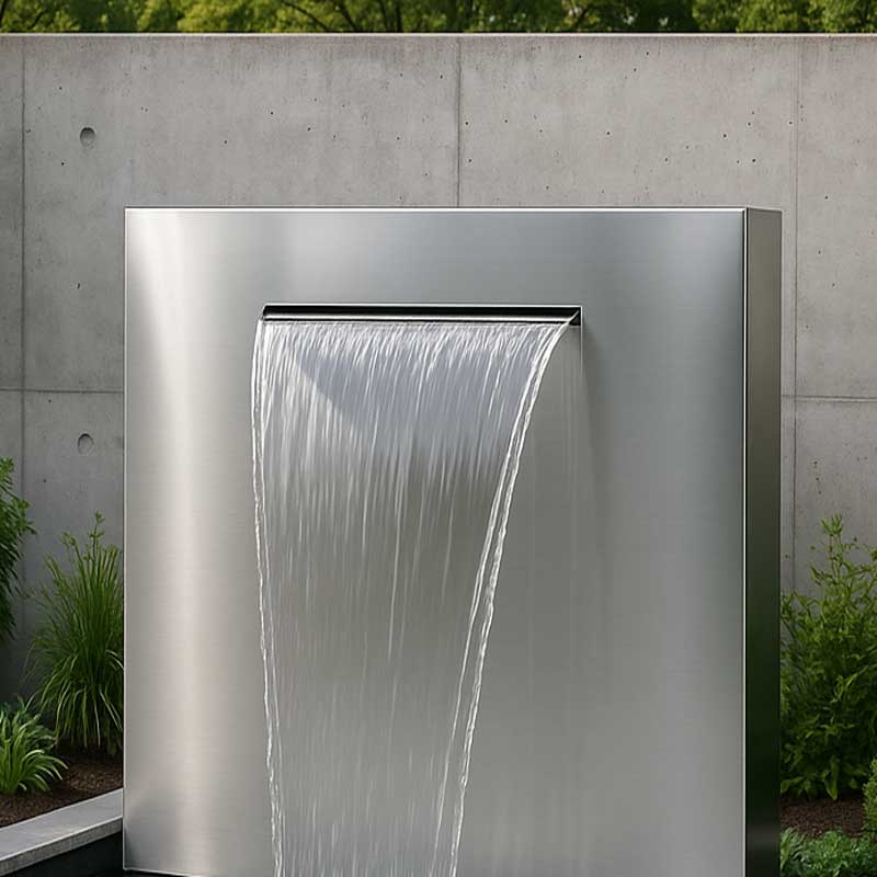 Ein wunderbarer freistehender Korpus aus Edelstahl mit einer Wasserfall-Schütte aus Edelstahl