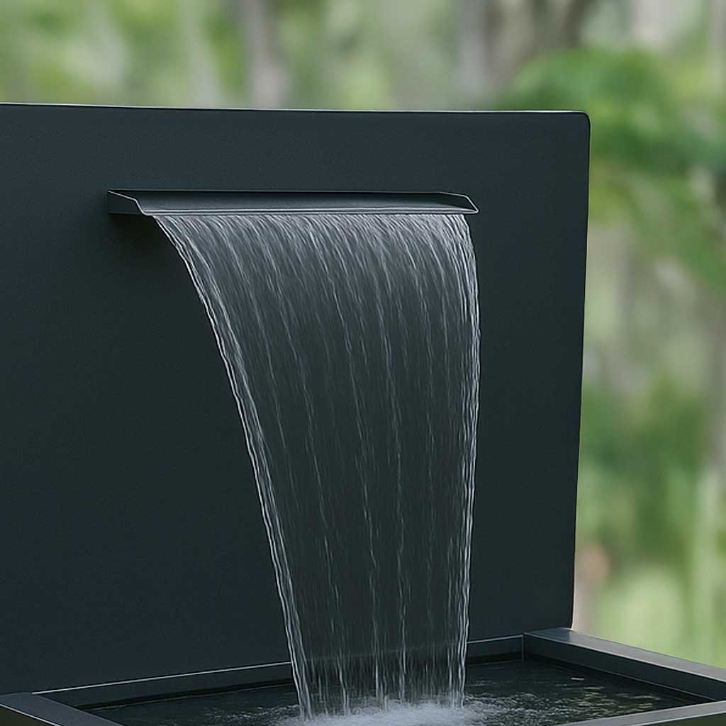 Ein wunderbarer freistehender Korpus aus farbig beschichtetem Aluminium mit einer Wasserfall-Schütte aus Edelstahl